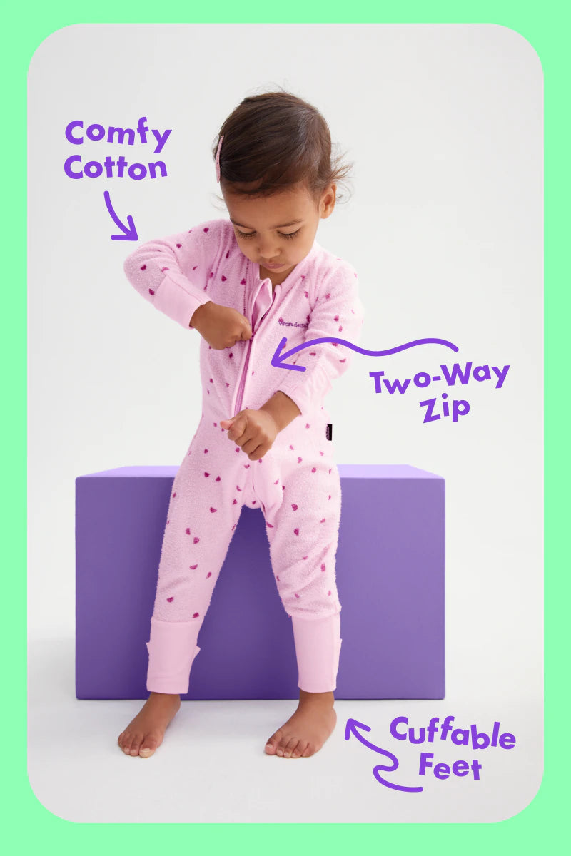 - Two way safety zip protects bub's skin and allows for quick nappy changes