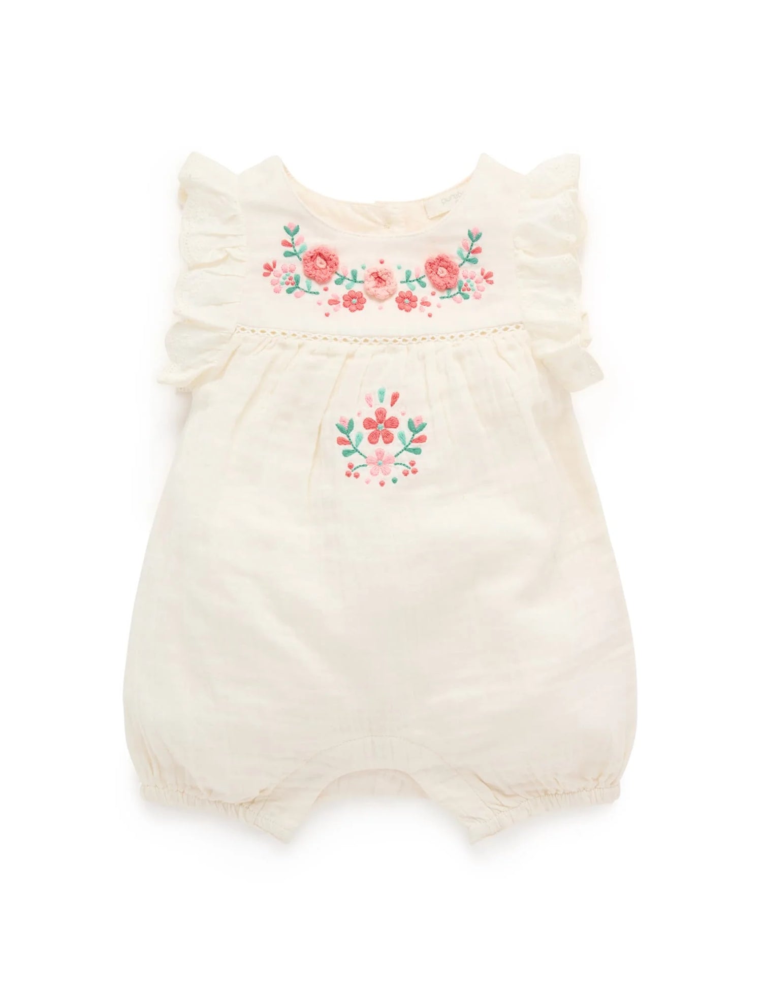 Our sweet Embroidered Romper is the perfect outfit for those special occasions. Featuring a pretty floral crochet and embroidery at the yoke and flutter sleeves with lace detailing. Designed as a balloon style, with gathers around the legs for a comfortable fit. Made from the softest 100% Organic Cotton muslin for a lightweight style.
